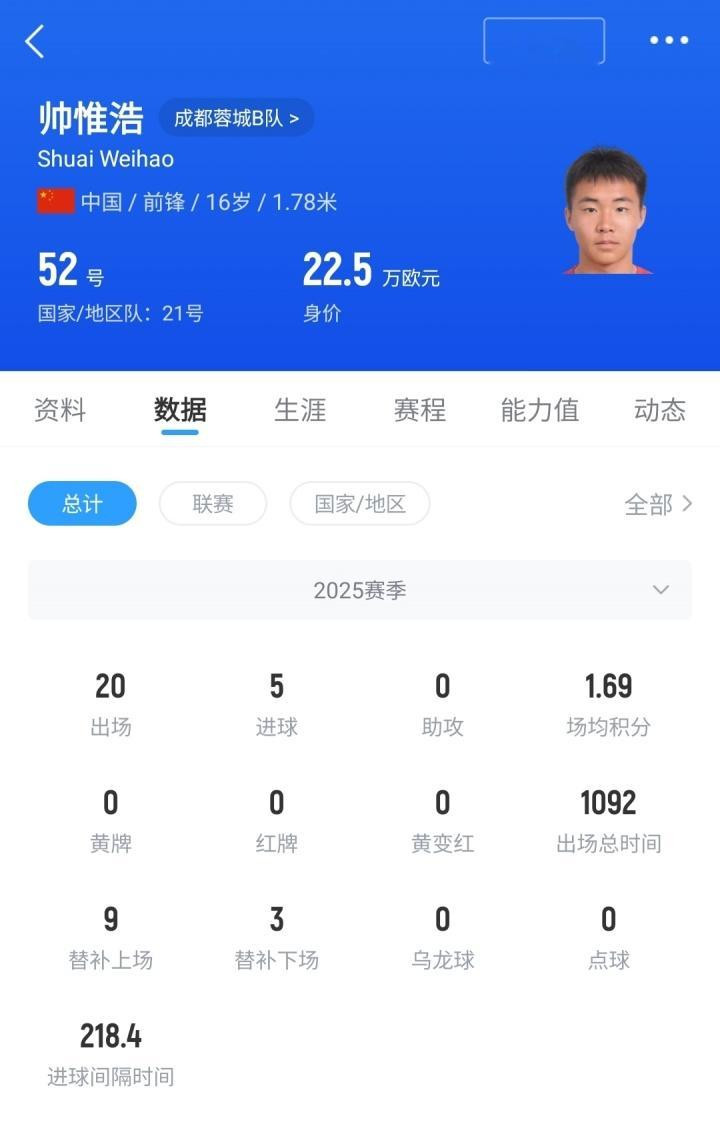 直播吧12月12日讯近日,德转更新了中乙球员身价,其中16岁的成都蓉城B队小将帅惟浩身价涨至22.5万欧,放眼世界范围2009年出生的球员中,帅惟浩的身价排名第22,亚洲第一!
